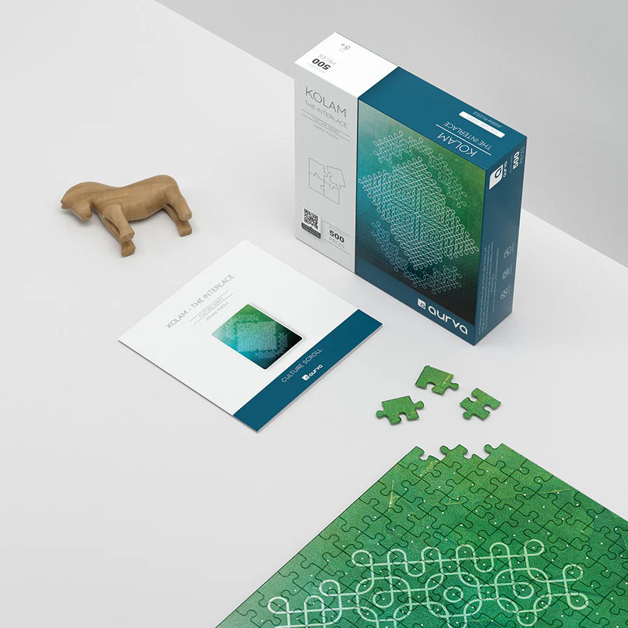Kolam - The Interlace is a 500 piece jigsaw puzzle that is part of the 'Aurva – Culture Series'. This puzzle features the intricate geometric pattern drawn at the threshold of homes from the South of India. This puzzle is designed with acute care to ‘enhance creativity & brain health’ while providing playful opportunities to explore age old culture.