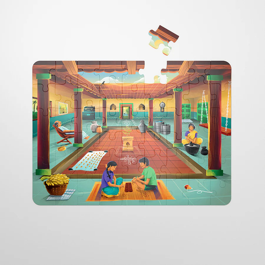 The Courtyard' jigsaw puzzle is part of the 'Aurva - Lifestyle Series'. The puzzle unfolds the stories from Ammu’s and Cheenu’s visit to their native village during the summer holidays. Here, the children explore the everyday life around the courtyard at Grandma’s home while understanding the underlying meaning of the traditional practices . We hope that you have fun exploring and unraveling the hidden stories. We wish that the puzzles become a common point of exchange, engaging parents, grandparents and children, while reminiscing and rejoicing the treasured memories.