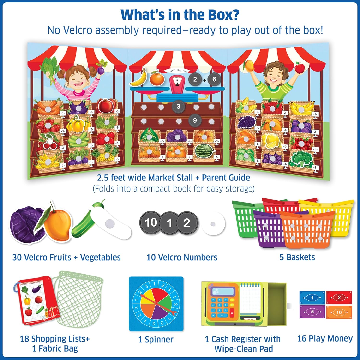 30 Velcro Fruits & Vegetables, 1 Supermarket Book, 5 Shopping Baskets, 10 Velcro Number tokens, 18 Shopping Lists, 16 Play Money Notes, 1 Mesh Bag, 1 Cash Counter, 1 Spinner, Instructions