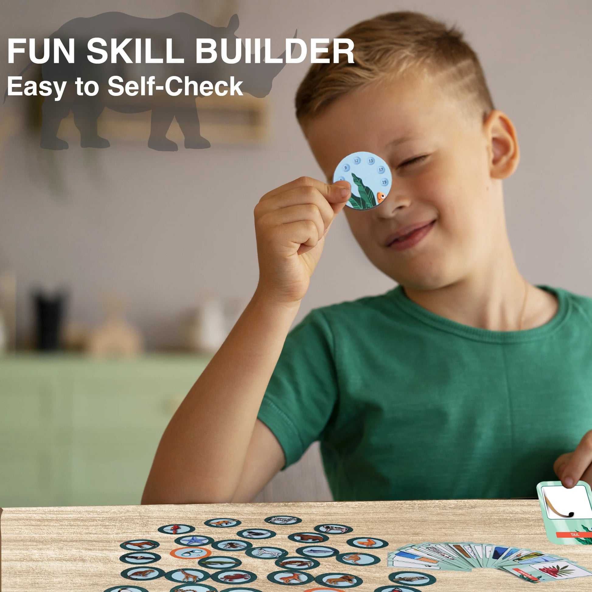 It's easy to learn and simple to play with a spot-it game mechanic. It only takes a few moments to explain and has quick gameplay. Easy to self-check by turning over the animal token.