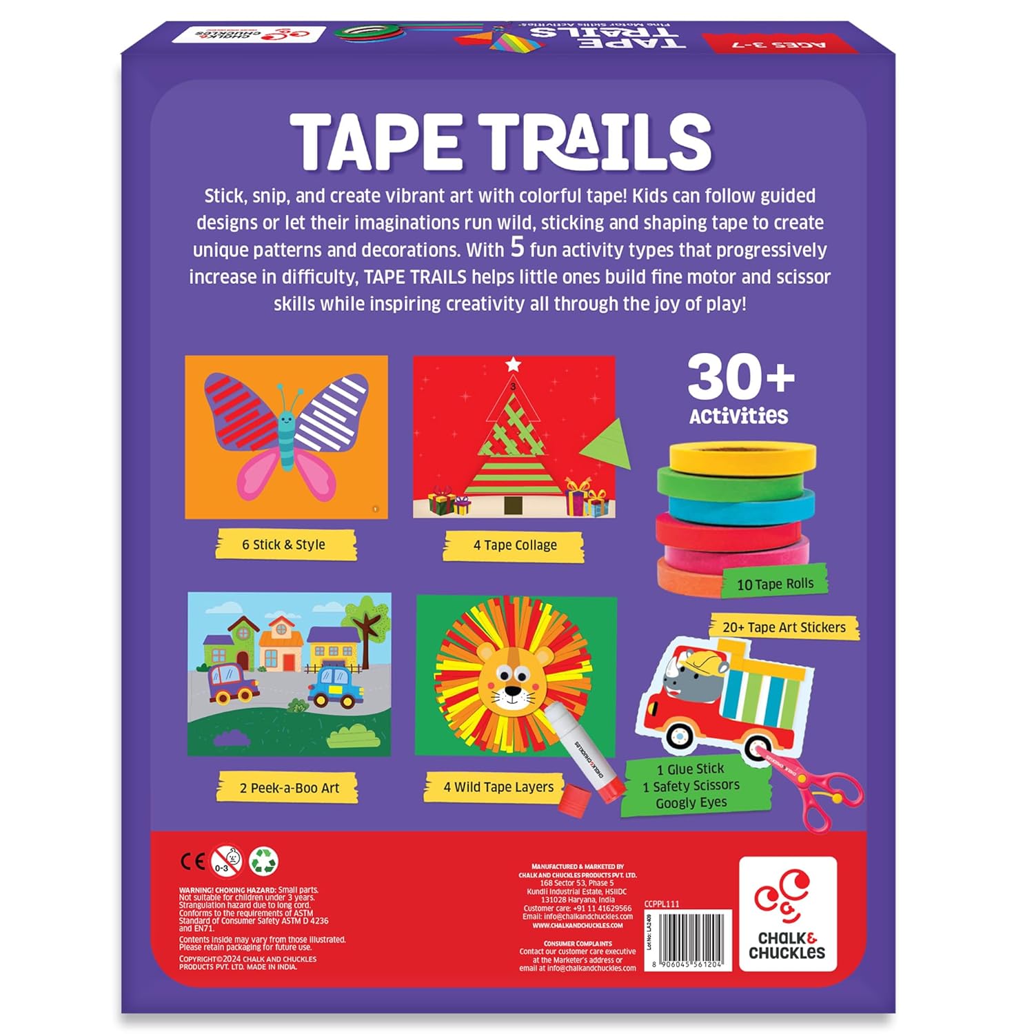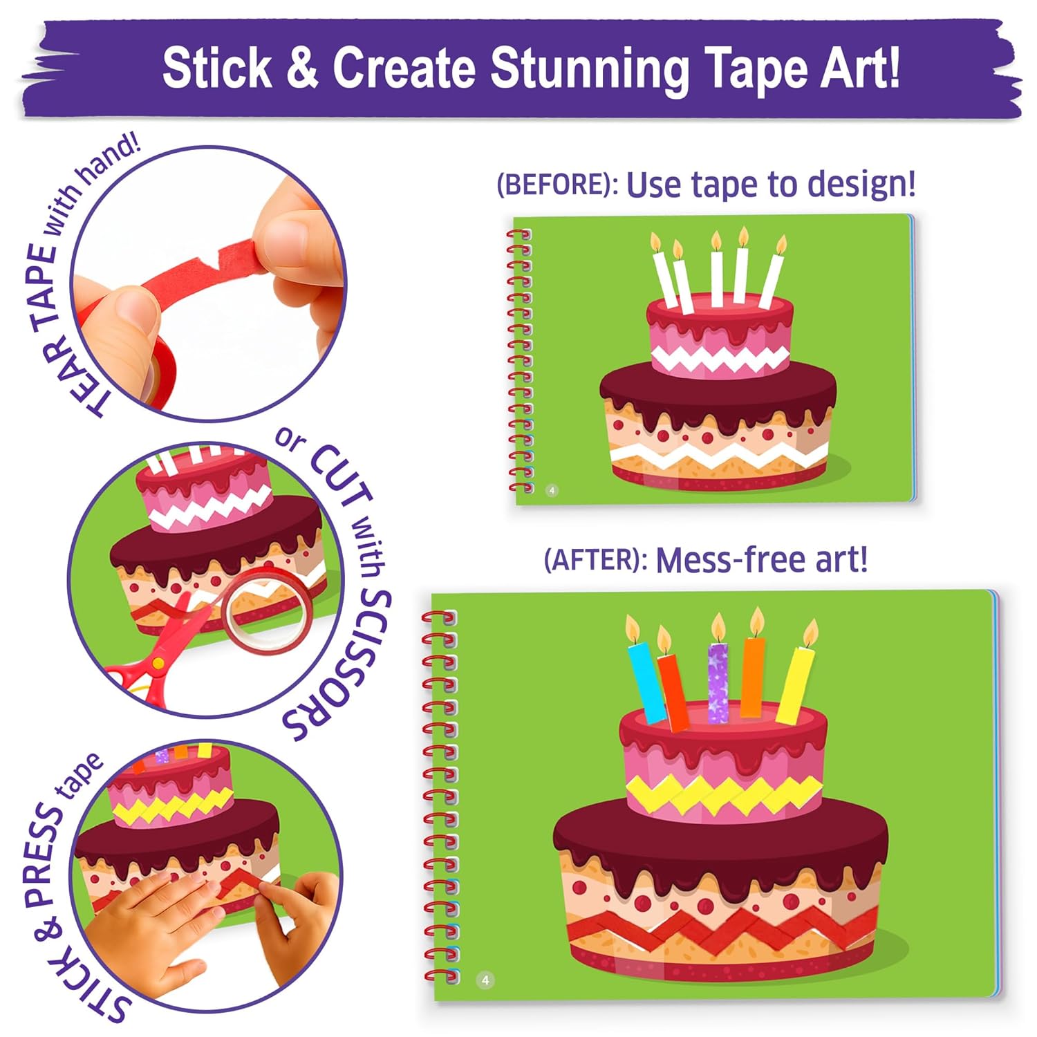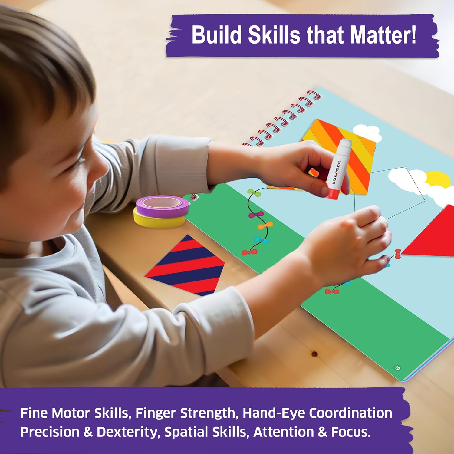Like coloring, but with tape! Tape Trails is a mess-free craft kit for kids ages 3–7 that turns colorful washi tape into hours of imaginative, skill-building fun. With easy-to-tear, repositionable tapes, child-safe scissors, glue stick, and googly eyes, kids can tear, cut, and stick to bring each page to life — no glue spills, no paint mess.