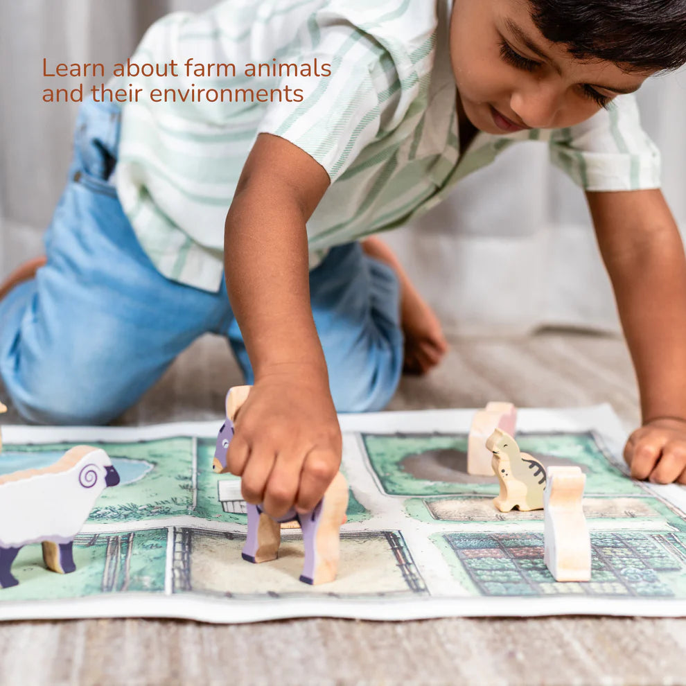 Wooden Farm Animals, Canvas Mat & Story Booklet