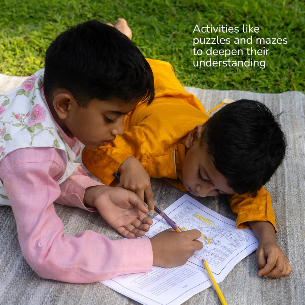 2: Activity cum Story book that tells the Ramayana Story in a kid-friendly manner and has colouring pages, stories, fun facts, mazes etc., all based on this glorious tale.