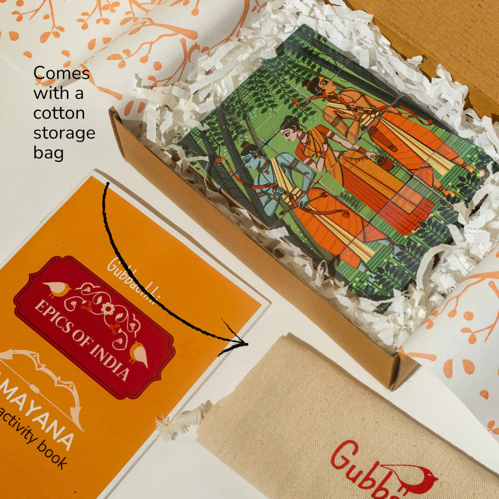 1: Set of 12 puzzle cubes. Made using all-natural wood. No MDF or plywood used. Arrange the cubes to form 6 different Ramayana inspired paintings. Each puzzle reveals a new side of the Ramayana story, bringing this epic tale to life for little ones.