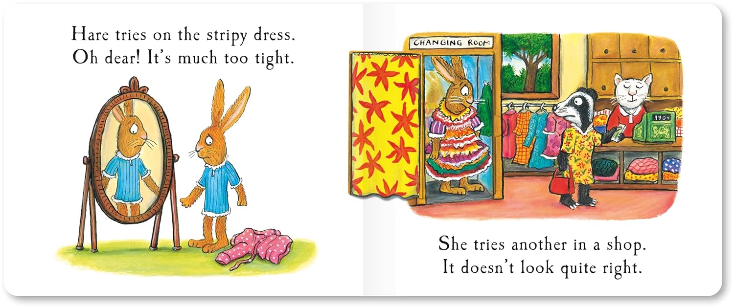 "Lift the flaps to join in the fun with Hare's New Dress, a story in the bestselling Tales from Acorn Wood preschool series by Julia Donaldson and Axel Scheffler, creators of The Gruffalo.