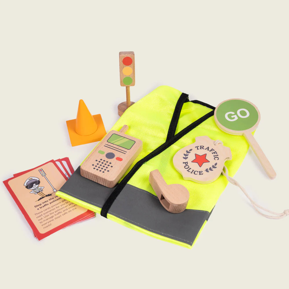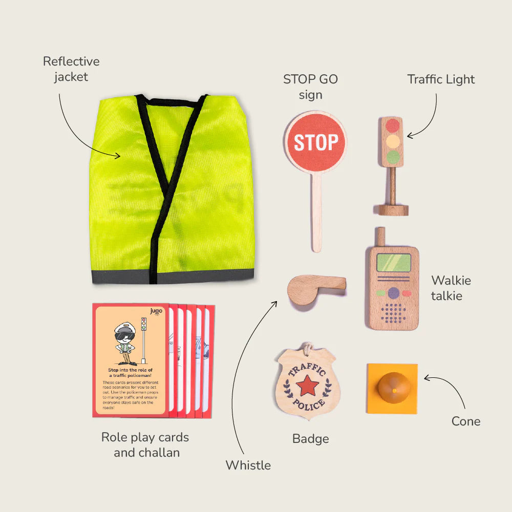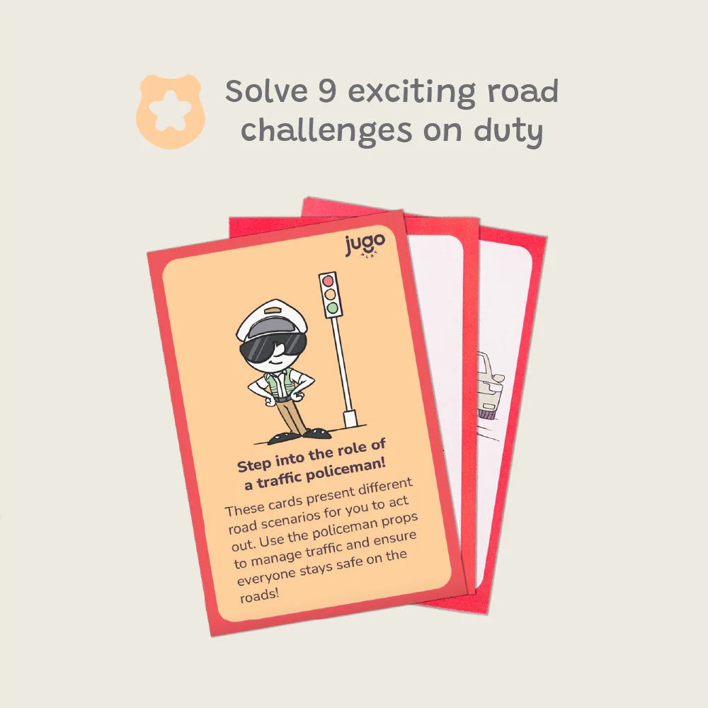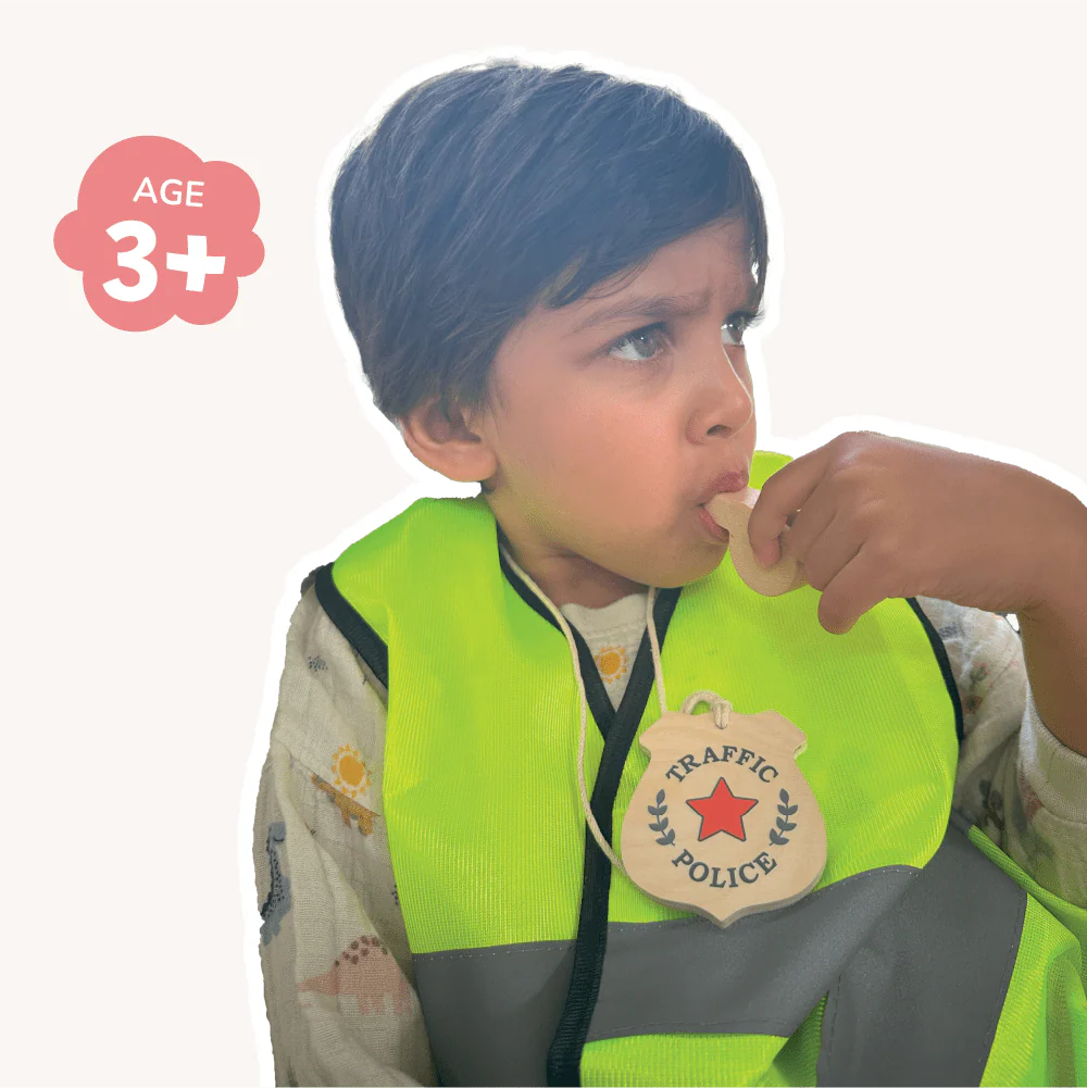 'Police on Duty' pretend play set lets your child step into the role of a traffic policeman! They can direct traffic, issue pretend challans, and ensure road safety- just like the real heroes. The interactive Role Play Cards provide exciting road scenarios, encouraging kids to think, act, and respond like responsible traffic officers. This fun-filled play fosters problem-solving, communication, and social-awareness, making learning about rules and responsibility an exciting adventure. Let your little policeman take charge!