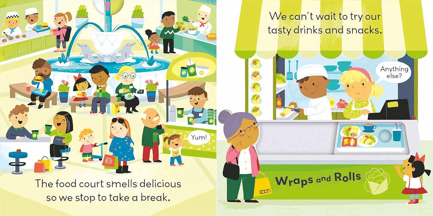 The gentle narrative is perfect for reading aloud, guiding children through the busy shopping centre as try on new clothes in the dressing room and pick a snack from the food court. A novelty slide, push or pull on every spread will engage children as they visit the busy and bustling shopping centre.
